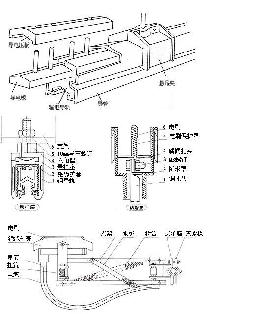 單極組合式滑觸線導電器:為接簧支撐式,僅在滑觸線下部即可推入,但須在牽引器同步進行,并保證拉簧力量適當,以免加大電刷磨損。牽引器與導電器同步進行,可用螺栓或電焊方式固定在行車等移動電器上,并適當保證導電器運行不受扭力。